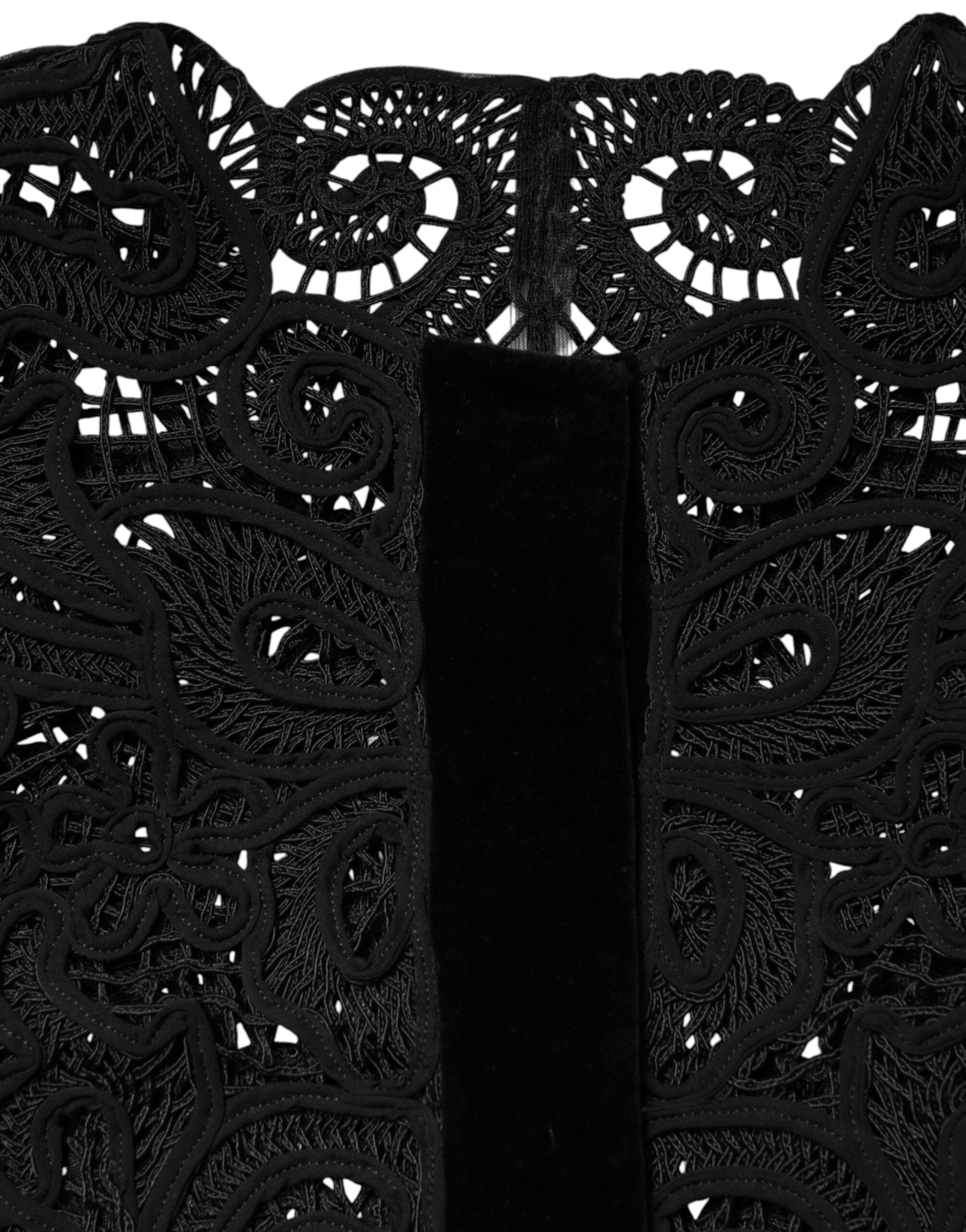 black cropped coat, crafted in exquisite floral lace. The intricate lace detailing adds a touch of romance and sophistication, while the cropped silhouette creates a modern, flattering fit. Perfect for layering over dresses or tailored separates, this jacket offers a chic statement piece for evening events, special occasions, or stylish daytime ensembles. A true reflection of luxurious Italian craftsmanship.