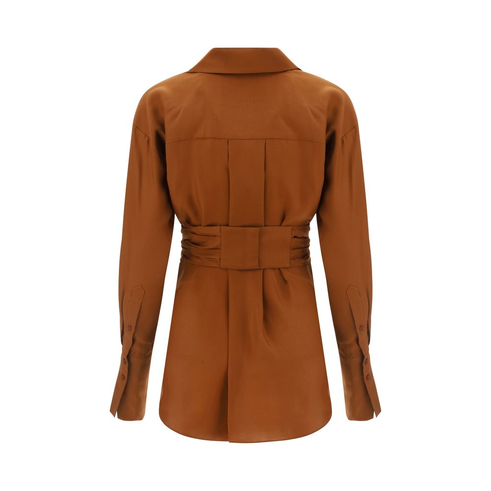 Silk Sabinas Shirt by Gauge81, low collar, monochrome cropped front design, front closure with invisible hooks, round side slits, adjustable cuffs with iconic brand signature engraved buttons.